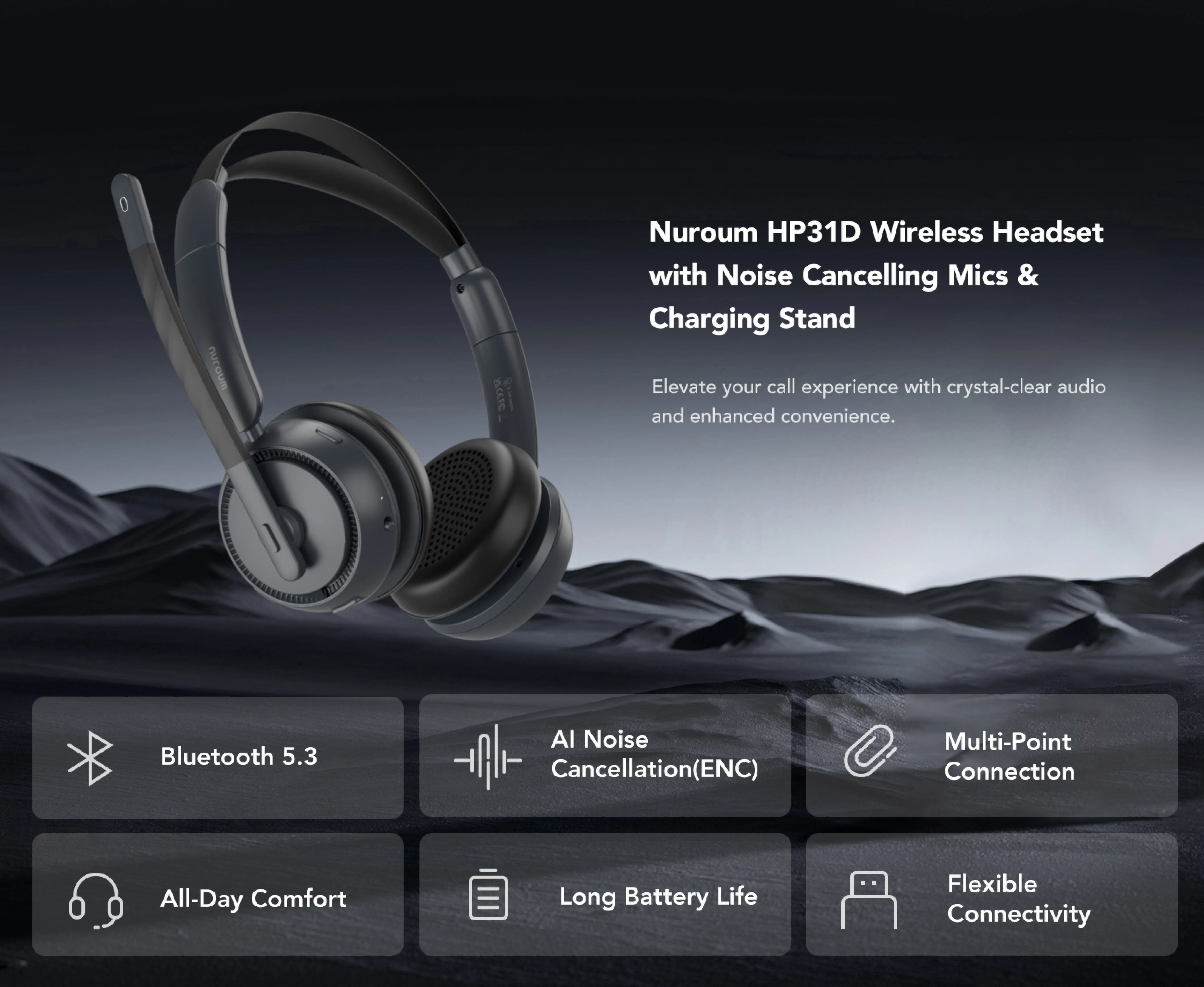 with dual-mic AI algorithm run on HiFi4 DSP, dongle for easy PC connection, 45H battery hour and charging stand.